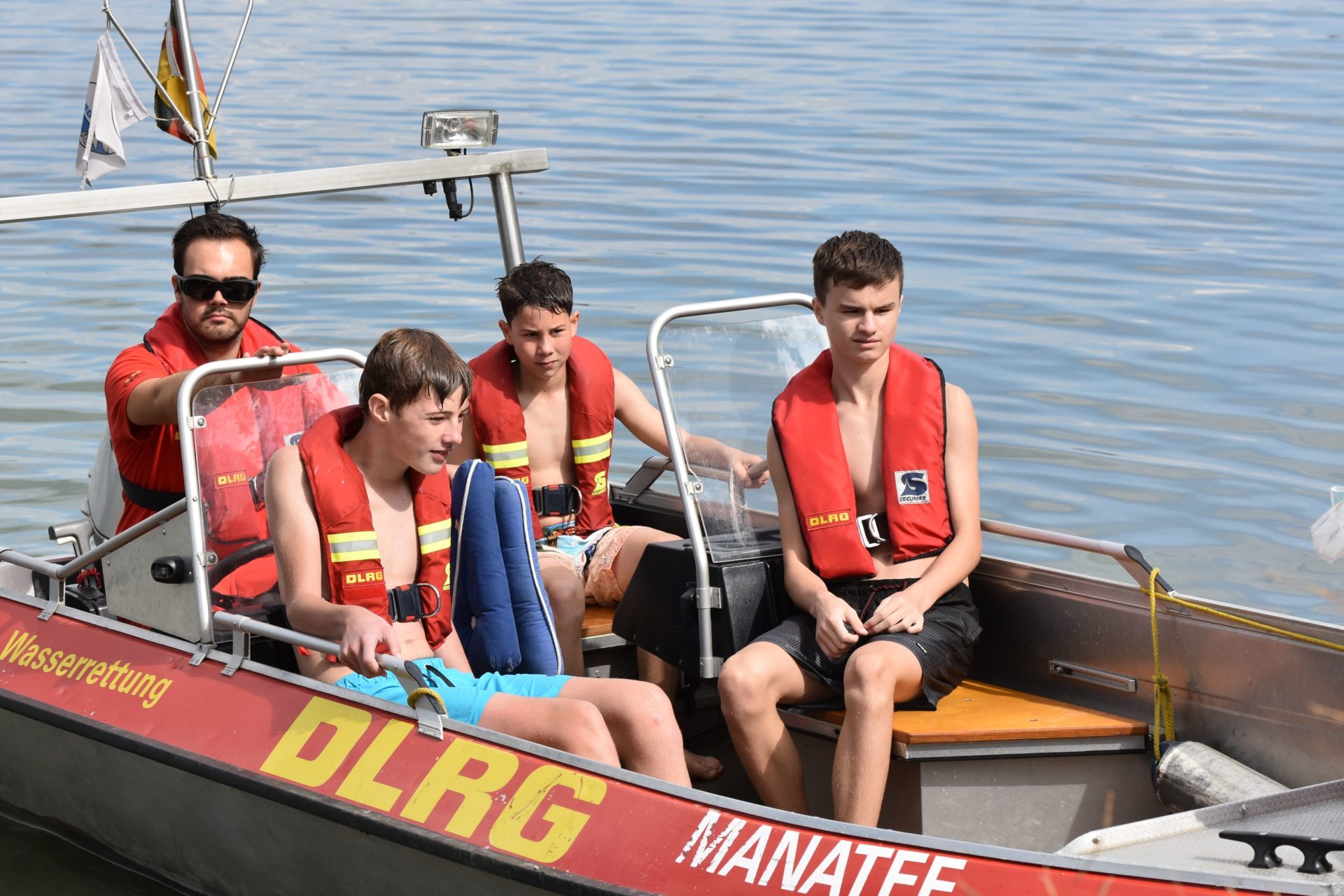 Das Wetter und die Wassertemperatur am Silbersee in Bobenheim-Roxheim spielte mit und so waren die Jungs mit Begeisterung bei den vielen praktischen Übungen dabei. Ein Highlight dabei war dann zum Abschluss eine Fahrt mit dem DLRG-Schnellboot über den Silbersee.