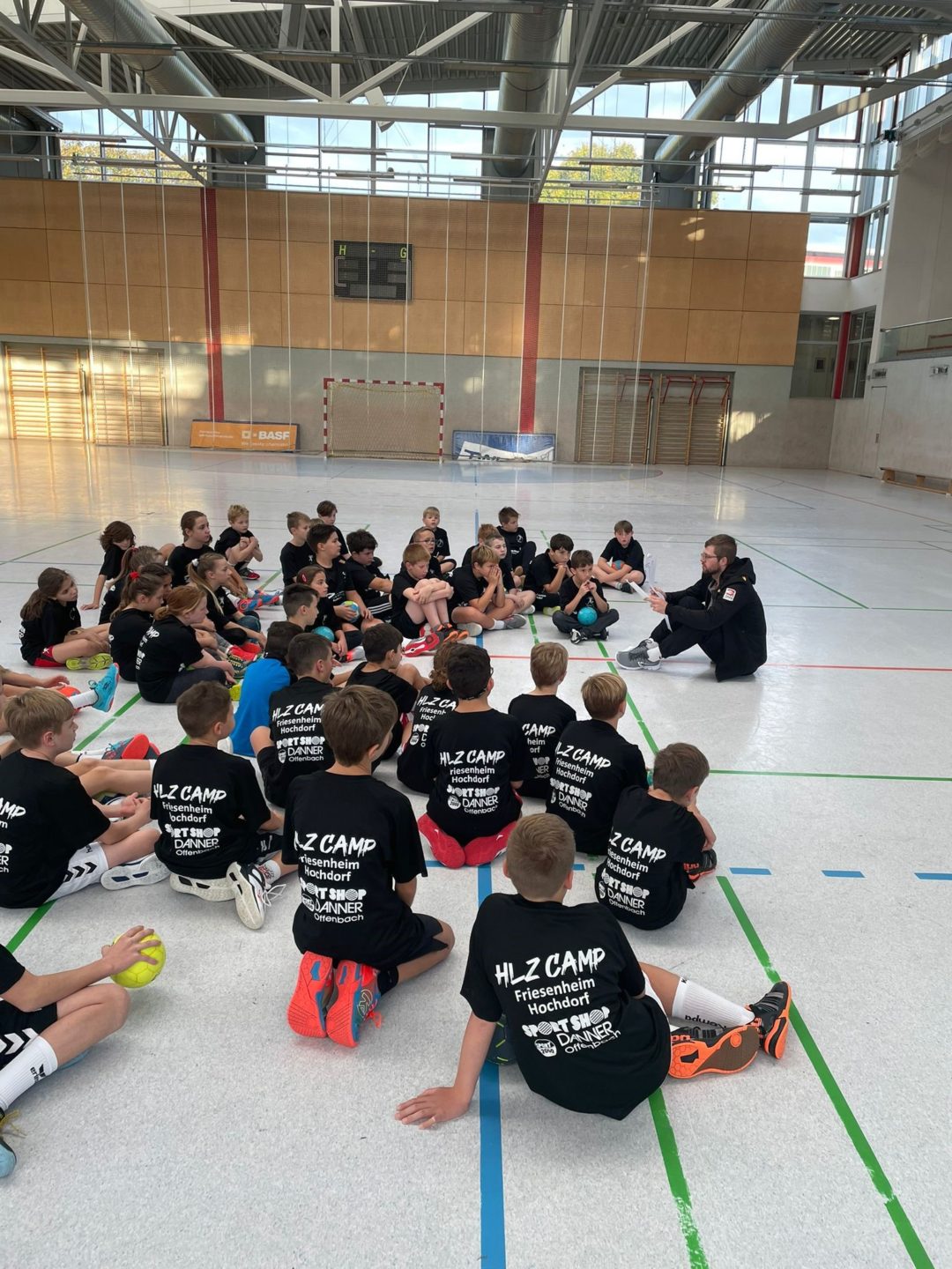 Die Handballcamps der TSG Friesenheim und des TV Hochdorf erfreuen sich schon seit einigen Jahren großer Beliebtheit. In den gerade zu Ende gegangenen Herbstferien konnte das HLZ Friesenheim-Hochdorf nach der langen Coronapause nun auch das erste gemeinsame Camp ausrichten. Vom 17. – 22. Oktober kamen insgesamt fast 80 Kinder und Jugendliche in den Sportzentren des TV Hochdorf und der TSG Friesenheim zusammen. Den Anfang machten die Großen der Jahrgänge 2007 – 2009 am Sonntag. Bei ihnen lag der Fokus vor allem auf der Vermittlung vielfältiger Handballgrundlagen. In den jeweils 75-minütigen Stationen konnten die Trainer sich mit den Nachwuchshandballern in Themen wie Schlagwurf, Körpertäuschungen oder individuelles Deckungsverhalten einarbeiten. Tipps und Hinweise gab es dabei auch von den Profis der Eulen Ludwigshafen und Spielern des Drittligateams. Marc-Robin Eisel und Jan Waldgenbach schauten sich nicht nur das Training an, sondern gaben den Spielern auch immer wieder Tipps und Hilfestellungen zu verschiedenen Trainingsinhalten. Bundesligatorwart Ziga Urbic unterstützte unseren Torwarttrainer Michael Ohmer bei der Arbeit mit den Keepern. Natürlich darf in einem Handballcamp auch der Spaß nicht zu kurz kommen. Nachdem alle Gruppen die Stationen des Tages abgeschlossen hatten, standen nachmittags noch verschiedene Wettkämpfe an, bei denen die Jugendlichen Spielwitz, Kreativität und Teamgeist unter Beweis stellen konnten.