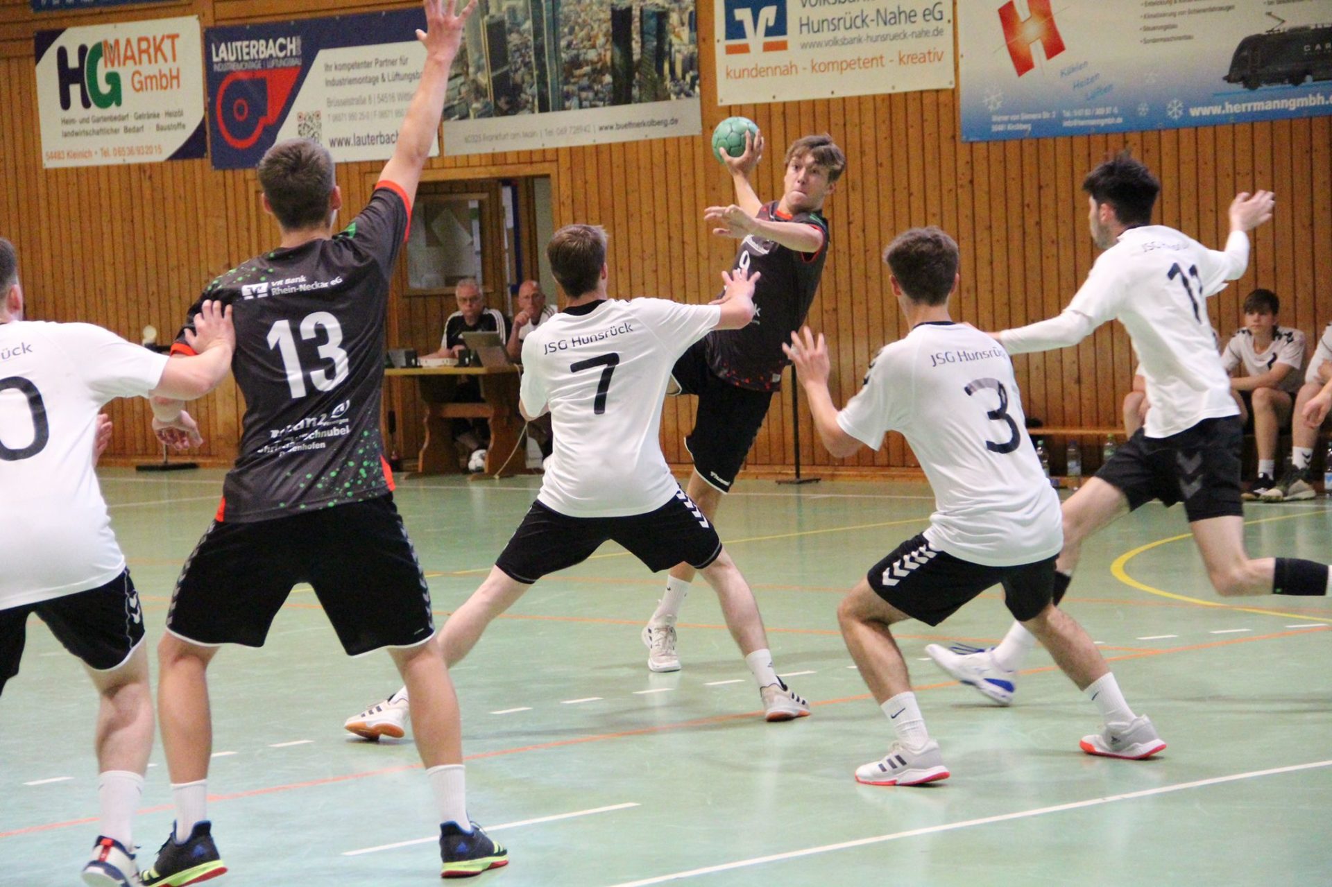 Zur zweiten Halbzeit signalisierte Lennard Fink, der zusammen mit Jan Schmidt einen sehr starken Innenblock bildete, dass er nicht mehr eingesetzt werden kann. Ein erster Rückschlag, der zu einer kompletten Wende des Spiels führte. Die JSG Hunsrück war jetzt deutlich besser im Spiel und traf zweimal über Linksaußen. Kurz darauf bekam unser Spielmacher Levin Bohn nach einer Abwehraktion die rote Karte. Die insgesamt sehr guten und kommunikativen Schiedsrichter Jan Stitz und Dario Lehmler werteten sein Eingreifen als Schlag in den Bauch und sprachen die Disqualifikation aus. „Eine grenzwertige Entscheidung, aber so war unsere Wahrnehmung“, erläuterten die Schiedsrichter nach dem Spiel die Hinausstellung. Dass dies aber zu einem kompletten Bruch im Spiel des HLZ führen würde, war da noch nicht absehbar. Lars Friedmann und Jakob Chrust hielten die JSG auf Distanz (11:15 in der 37. Minute). Doch die Gastgeber witterten jetzt ihre Chance und auch das Publikum war jetzt voll da. Lautstark trieben Sie ihr Team an und es folgten drei Tore in Folge von Spielmacher Jona Fink. In der 43. Minute war das Match wieder ausgeglichen (16:16). Selbst in dieser Phase spielten die HLZ-Jungs nicht schlecht, scheiterten jetzt aber immer wieder mit klarsten Chancen am schier unüberwindlichen Torhüter Mauro Neu. Drei Tore von David Wolsiffer, Joshua Kontschak und Ari Spindler schienen unser Team wieder auf die Siegerstraße zu bringen (16:19, 48. Minute), doch Hunsrück ließ sich jetzt nicht mehr abschütteln. In der 54. Minute folgte die erste Führung der Heimmannschaft, die sich in der Schlussphase den Sieg nicht mehr nehmen ließ. Am Ende stand ein viel umjubelter 25:23-Sieg der JSG Hunsrück auf der Anzeigetafel.