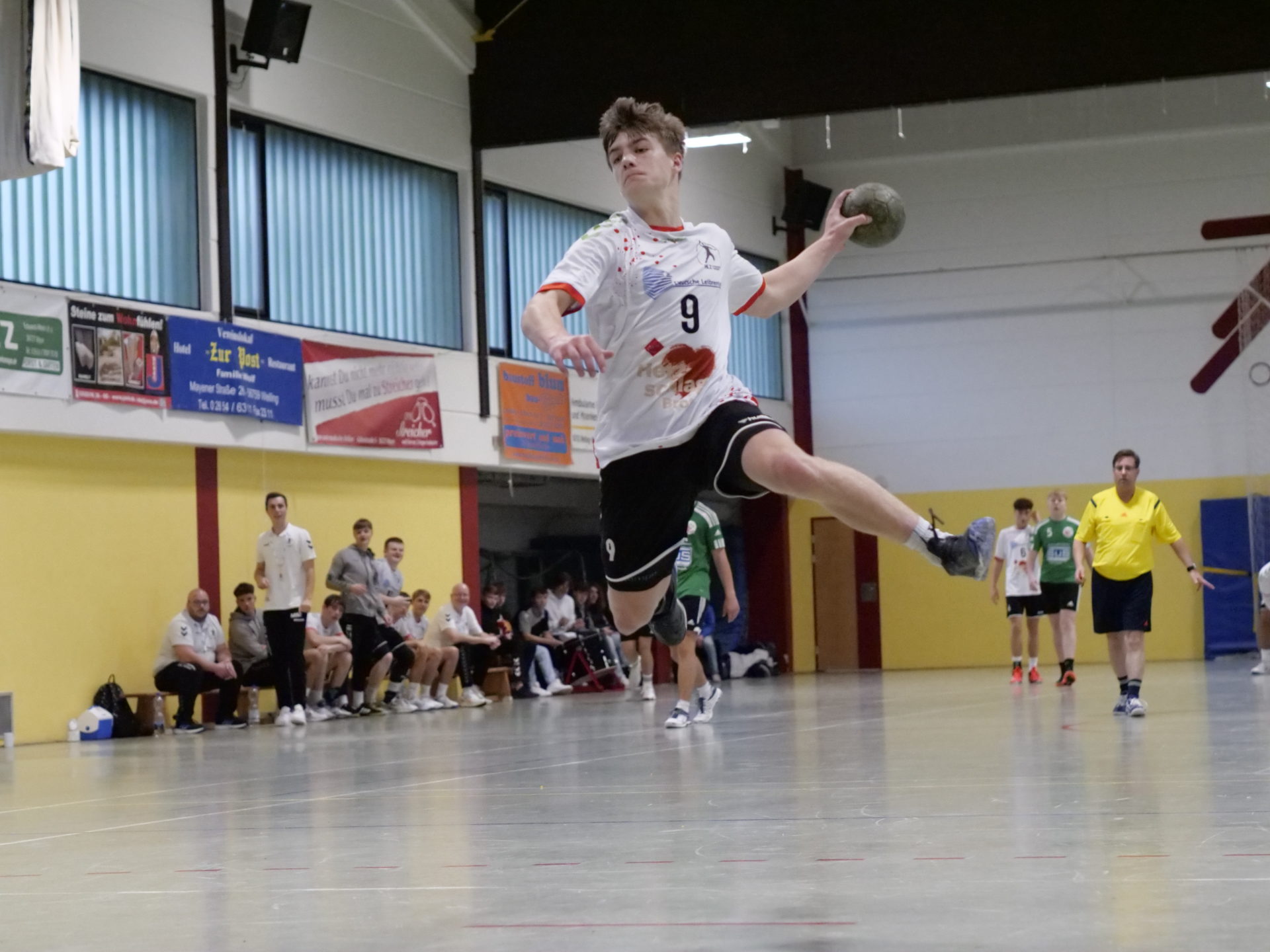 Auch hier war die Tribüne gut besetzt und die Gastgeber machten ordentlich Stimmung. Die ersten Minuten waren wie am Tag vorher, tolle Abwehr und dadurch einfache Tore. Aber unseren Jungs war die frühe Zeit oder das Spiel ohne Harz anzumerken. Es wirkte alles irgendwie wackelig und nicht souverän. In der 8. Minute beim Stand von 1:7 nahm der Gastgeber die frühe Auszeit und bei unseren Jungs schien nun der Faden gerissen zu sein. Jetzt kassierten wir die Tore und das Angriffsspiel blieb unsicher. Beim Stand von 8:10 war Urmitz wieder dran, und Malte nahm die 1. Auszeit. Dennoch gelang Urmitz der Ausgleich und ging kurz danach sogar mit 11:10 in Führung. Es war eine Phase, in der wir den Gegner und den Torwart endgültig aufgebaut hatten und selbst klarste Chancen vergaben und am Torhüter scheiterten. Mit Müh und Not ging es mit einem Tor Unterschied mit 11:12 in die Halbzeit.