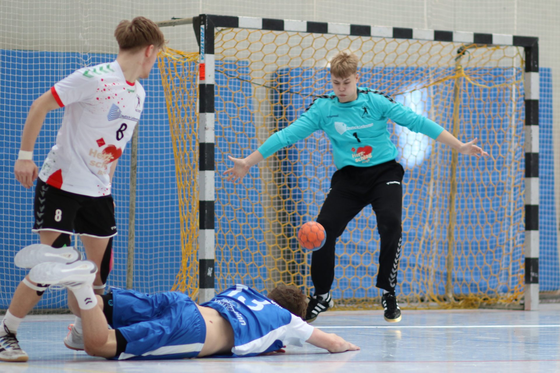 Und die ersten Minuten des Spiels fingen auch gleich gut an. Eine sehr konzentrierte Abwehr stellte den Gegner vor zahlreiche Probleme und deren Angriffsspiel kam nicht zur Entfaltung. Schnell konnte Freddy auf 2:0 stellen. Mehrere Paraden von Daniel im Tor führten dann zum 7:2 in Minute 13 und hielten den Gegner in Schach. Dies war auch wichtig, denn auf unserer Seite wurden einige Chancen nicht genutzt. Ein 4-Tore Lauf von Nieder-Olm führte dann zum 10:8, etwas Spannung kam auf. Aber mit einem absolut verdienten 14:9 ging es in die Halbzeit. Zu diesem Zeitpunkt hatte Daniel bereits 11 blitzsaubere Paraden gezeigt und Freddy 6 mal getroffen.