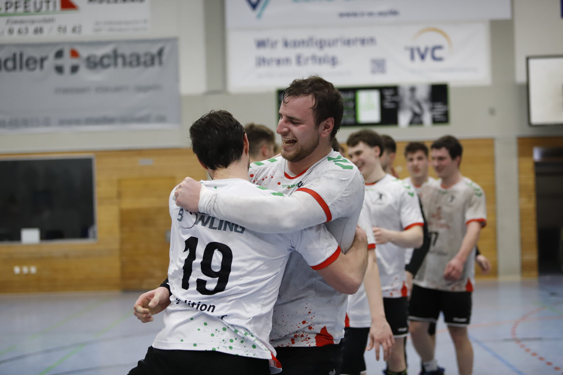 Die zweite Halbzeit war dann ein toller Handballfight auf guten Niveau. Die Abwehr stand weiter gut, Rot-Weiß-Grün konnte die Kreisanspiele besser verteidigen und sich einige Bälle stibitzen, wie der in der Mitte gut dirigierende Luca Metz zum 17:18, der ins Empty Goal traf. Das Spiel war Mitte der zweiten Halbzeit völlig offen. Dansenberg wurde aber nervöser und machte mehr technische Fehler. Malte Dorra übernahm zusammen mit Abwehrfels Nils Mader und Außenblitz Moritz Schulz die Verantwortung. Im Tor spielte sich Tobi Repp in den Flow und parierte reihenweise Würfe. Erstaunlich, dass auch die jungen von der A-Jugend, wie Max Diener, eine ruhige und konzentrierte Abwehrleistung zeigten. Kam Dansenberg heran, fassten sich die Jungs ein Herz und kamen ebenfalls zu guten Abschlüssen. In den letzten Minuten deckte die TuS sehr offensiv und kam über 22:25 nochmal heran. Es schlichen sich technische Fehler ein und beinahe wurde nochmal alles verschenkt. Das Spiel war auf dem Siedepunkt, als Schwarz-Weiß zum 26:26 Ausgleich traf. Die Zuschauer tobten. Dann der Show-down: 13 Sekunden vor Schluss (27:27). Malte Metz nahm die Auszeit. Das HLZ bekam noch einen Freiwurf, die Zeit war abgelaufen. Direkt von der Mitteposition hob Malte Dorra geschickt den Ball über die Mauer und traf in den rechten oberen Winkel. Die Mannschaft lag sich jubelnd in den Armen, hatte man in Dansenberg schließlich ein schweres Abstiegsspiel verdient gewonnen.