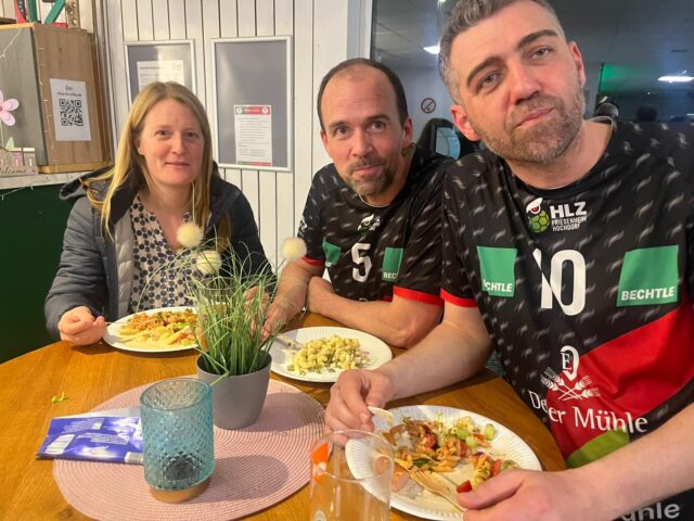 „Das ist die dritte Halbzeit“, sagt Tobi Repp von der HLZ Männermannschaft 3, von denen einige beim Turnier zuschauten, und lacht. Gemeint ist der Teil, der in keiner Spielordnung auftaucht: das gemeinsame Essen, das Zusammensitzen, das Wiedersehen alter Weggefährten. Die Spielerfrauen der Männer 4 des HLZ haben ein internationales Salatbuffet vorbereitet, dazu gibt es deftige Rinds- und Servelatwürste – eine Mischung aus Turnier, Vereinsfest und Klassentreffen.